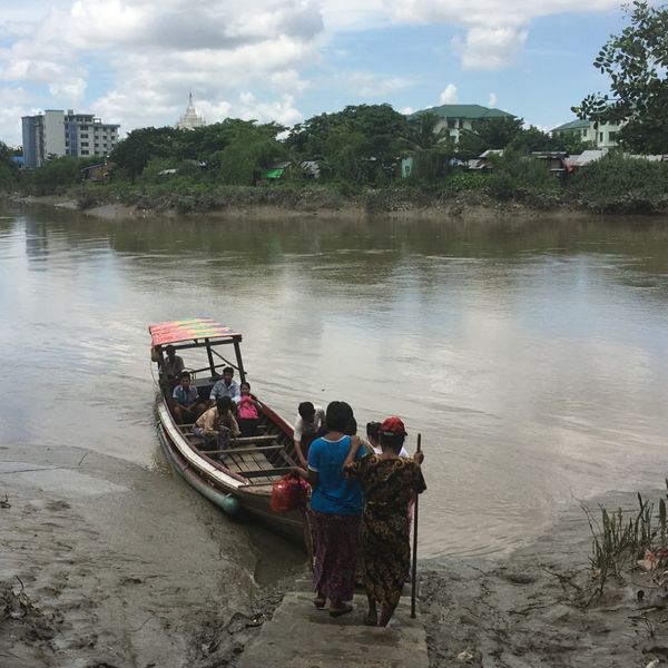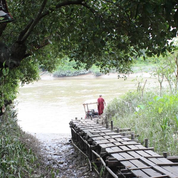 A boat leaves about every twenty minutes and there is only one boat in use. Each ride costs 100 kyat for one way. Around 500 people use this boat service every day, often nuns travelling back and forth to the temple. Except when it's high tide, then they’ll use the concrete bridge further up the river instead.