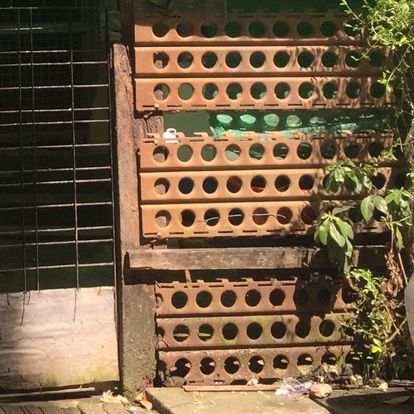 The front fence of this house is made up of perforated steel panels, known as ‘Marston Mats’. These interlocking high strength, non-rusting panels were made in the millions by the US Army in World War II for laying down on a field for quick construction of an airstrip to land war planes. After the war the ‘mats’ were repurposed by locals for fencing. Also good for storage of empty bottles, and pot plants!