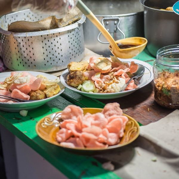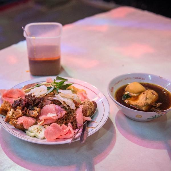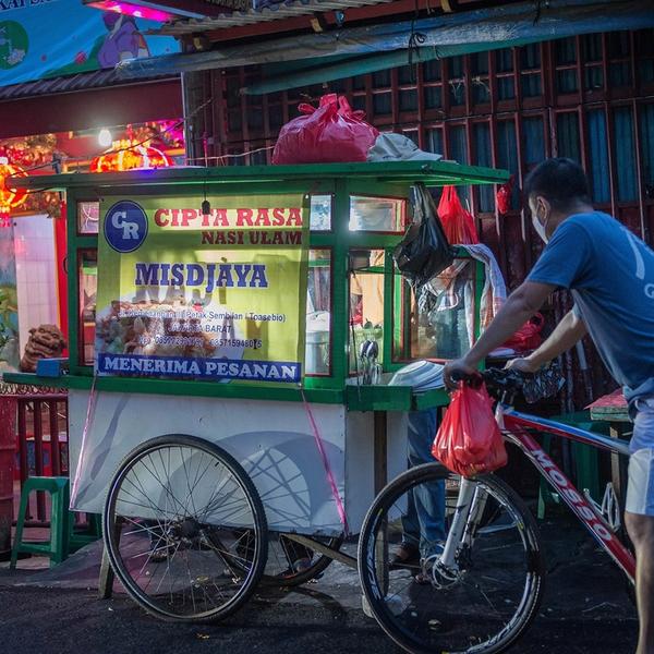 The base for nasi ulam is nasi lemak, rice cooked in coconut milk. What makes this dish so unique is its hearty stew based on a traditional Dutch soup recipe. It's then garnished with kemangi (herb, chilli, sliced cucumber) and dendeng sapi (beef jerky) and topped off with a sprinkle of peanuts and kerisik (grated coconut). "The secret of the recipe is that the soup has to cook for more than twelve hours," restaurant owner Pak Misdjaya explains. He took over the business from tits original Chinese owner, Cek Lam Seng.