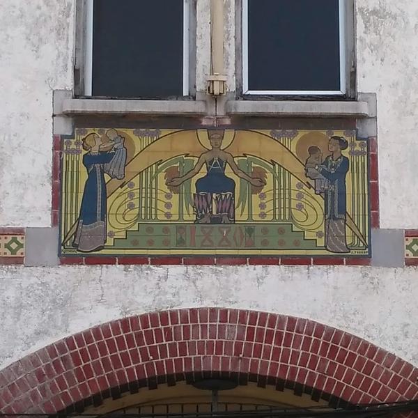 How to recognise Berlage’s style? The brick arches formed by stone blocks are typical Berlage elements and the ornamental pillars. The eye-catching decorative details on the façade are by colleague architect Jan Toorop. The painting portrays two mothers with child, one European one Indonesian. The grains and hourglasses refer to the book of Genesis 41 (about the seven prosperous and seven meagre years) symbolising the importance of having insurance!