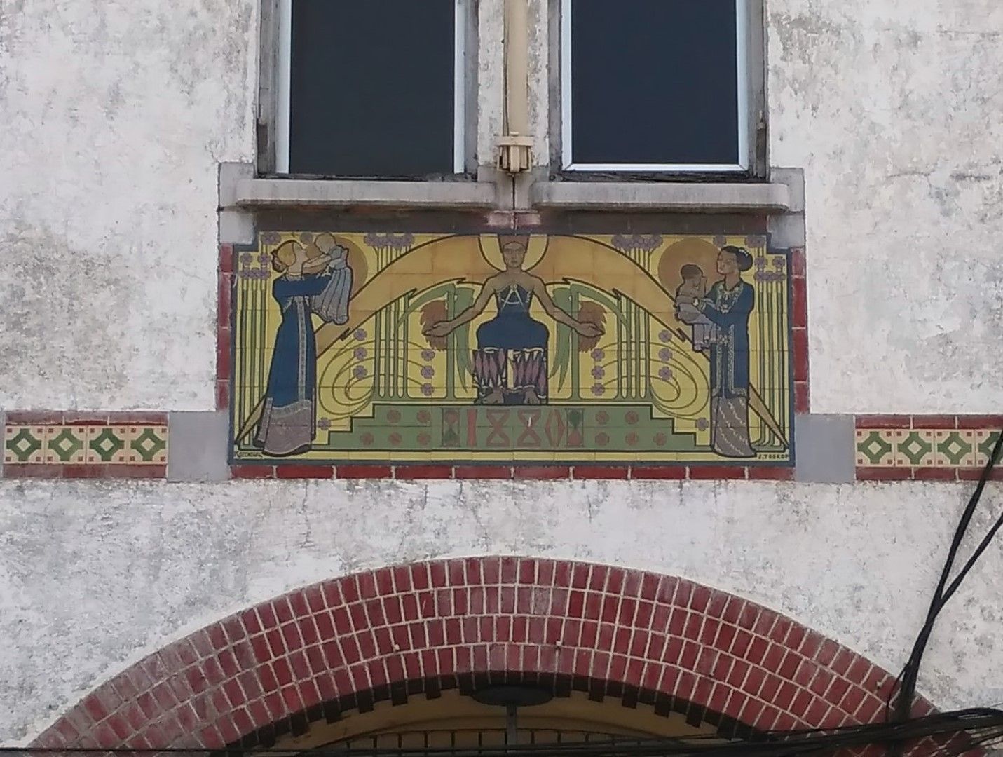 How to recognise Berlage’s style? The brick arches formed by stone blocks are typical Berlage elements and the ornamental pillars. The eye-catching decorative details on the façade are by colleague architect Jan Toorop. The painting portrays two mothers with child, one European one Indonesian. The grains and hourglasses refer to the book of Genesis 41 (about the seven prosperous and seven meagre years) symbolising the importance of having insurance!
