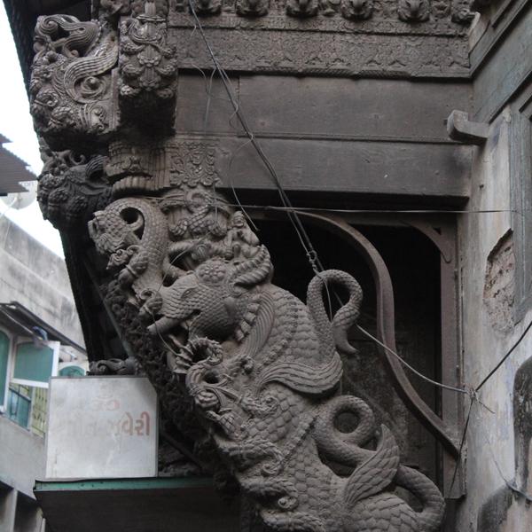 Fatasa Pol has countless intricately carved, beautiful havelis, home to many successful Hindu and Jain entrepreneurs, mill-owners, cotton industrialists and jewellers. ”The owner of Nutan Textile Mill lived right here” says an eager Harshadbhai, pointing to the remains of an old Haveli. Many houses with beautiful polished wood carving, and bright coloured walls dot the nine pols within this pol- Navi pol, Brahmpur, Hirabhai, Lala no khancho, Deravalo khancho, Kanti pol, Kachrasa ni Khadki, Matradev ni Pol, Fatasha ni Khadki.