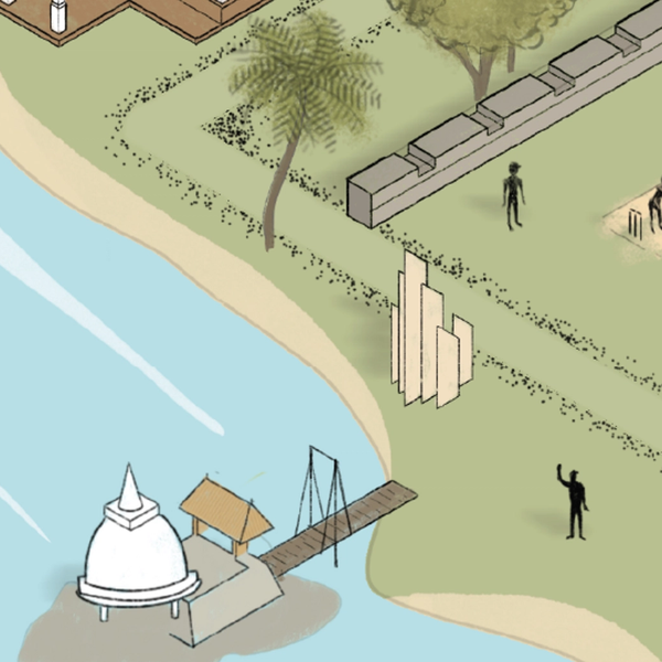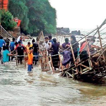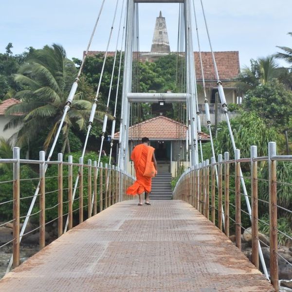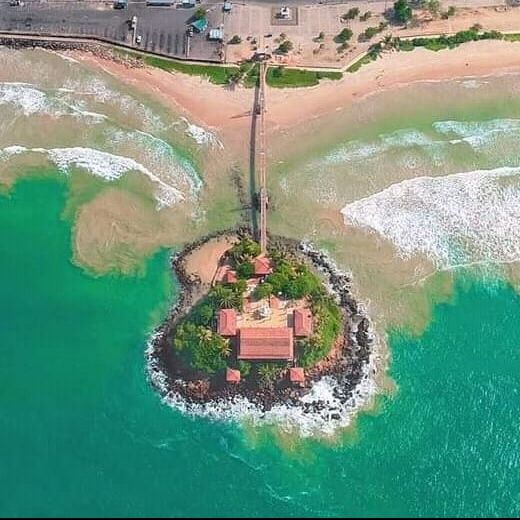 The old bridge - also a symbol of Matara city - to Pigeon Island collapsed in 2022, injuring 60 visitors. Now a bunch of bonded sandbags connects the temple to the city centre. The island is eroded by the seashore and monsoon season with the Nilwala River water adding its own colour to the seawater around it.