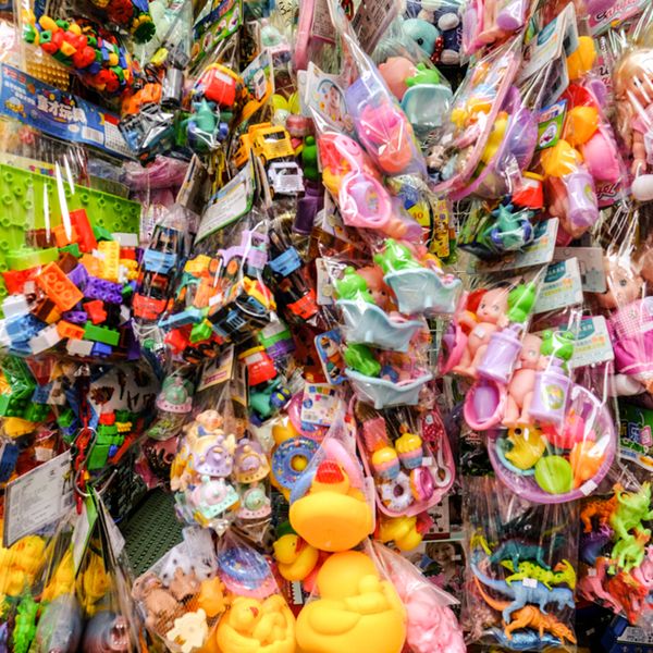 Colourful plastic toys, dolls, shoes & flowers