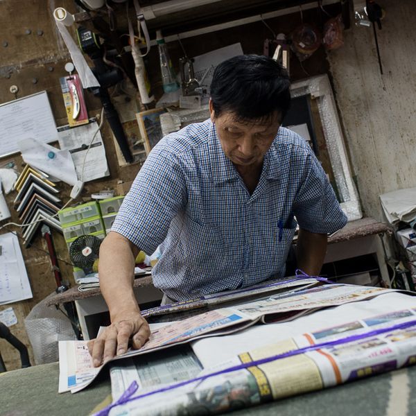 Yau Ma Tei neighbourhood is full of old shophouses with glass windows. During typhoon seasons, many of these windows were broken and in need of repair. This is why there are many glasswork shops here. Tong Lee Glasswork started in 1980, making gift mirrors, picture frames and fish tanks, or anything that requires glass cutting. Although many shophouses have strengthened their windows, Yau Ma Tei residents still rely on Tong Lee for a quick fix.
